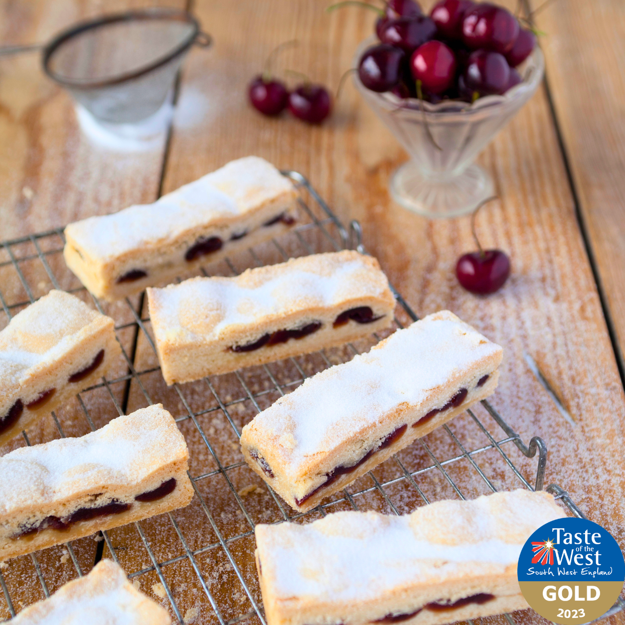 Classic flavours are what this delicious bake is all about… rich, buttery shortbread encases a generous layer of sweet, glistening jewels of delicious French candied cherries. Topped with a drift of caster sugar, this confection is a perfect example of a clever combination of great tasting ingredients and nothing else… ideal for a refined afternoon treat with a good cup of tea.